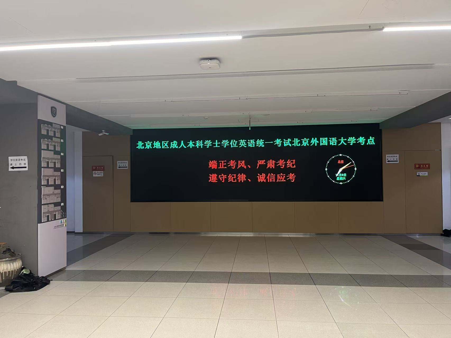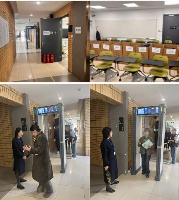 考试当天,北外网院考务工作小组对各考场布置及监考安排进行了全面核查,营造庄重严肃的考试氛围,考点设有考场专用存包处,考生进入考场前先存包后安检,按照监考人员的指示有序通过“安检门”,检查合格后方可进入考场区域。